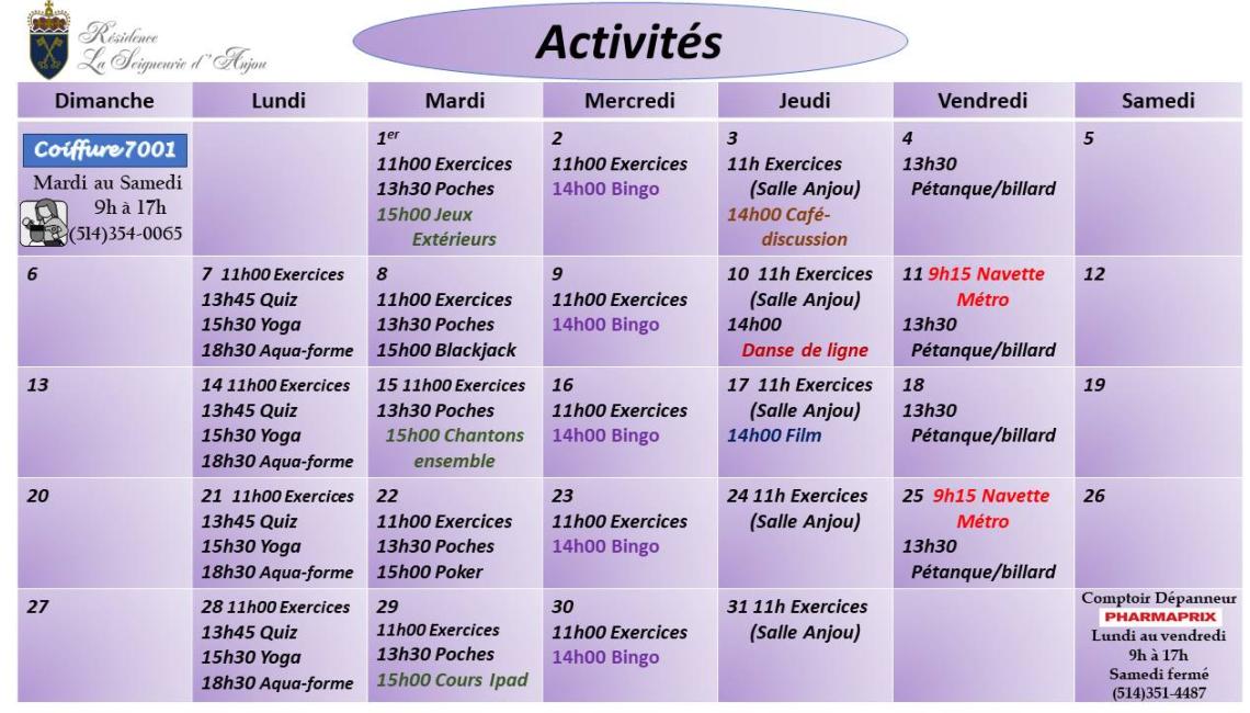 CALENDRIER D'ACTIVITÉS